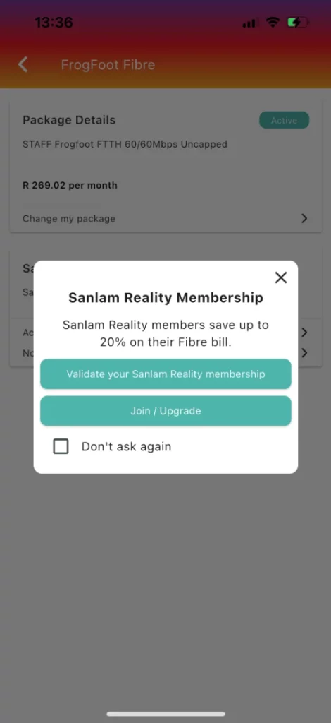 Once on your Manage Fibre service page you will either see a pop up or a “Sanlam Reality Membership” section.